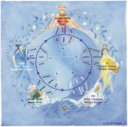 "Kun tyttö on 7-vuotias, hänen Munuais-Qinsä on runsas, jolloin rautahampaat kuten ihokarvoituskin voi kehittyä. 14-vuoden iässä tyttö saa kuukautiset(tian-gui), mikä mahdollistaa extrameridiaanien, Renmain ja Chongmain, aktiivisen toiminnan: kuukautiset tulevat ja hedelmöittyminen käy mahdolliseksi. 21-vuoden iässä Munuais-Qi saavuttaa maksiminsa, elimistön kehitys pysähtyy ja viisaudenhampaat kasvavat. Kun tyttö on 28-vuotias, hänen kehonsa elää kukoistuskauttaan ja hänellä on vahvat lihakset ja luut, paksut ja hohtavat hiukset. 35-vuoden iässä elimistö alkaa heikentyä ja varhaiset ikääntymisen merkit ilmestyvät: kalpeat kasvot, rypyt ja hiusten väheneminen, mikä johtuu Yangming-meridiaanin taantumisesta. 42-vuoden ikäisenä naisen 3 yläkehossa virtaavaa Yang-meridiaania alkavat hupenemaan, mikä johtaa kasvojen roikkumiseen ja hiusten harmaantumiseen. Kun nainen on 49-vuotias, kuukautiset päättyvät, Renmai ja Chongmai tyhjenevät ja romahtavat: keho rapistuu yleisesti ja kuukautisvuoto ja synnyttäminen päättyvät."